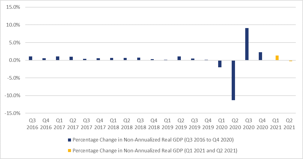 Figure 1 – Percentage Change in Non-Annualized Real Gross Domestic Product (GDP), Canada, Third Quarter of 2016 to Second Quarter of 2021 (%)