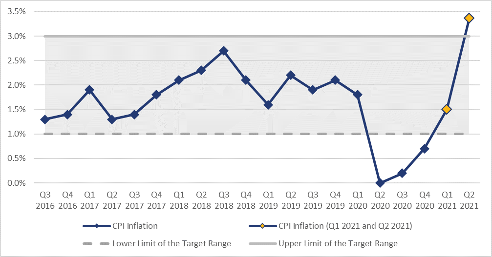 Figure 3 – Year-Over-Year Change in Consumer Price Index (CPI) Inflation and the Bank of Canada’s Inflation Target Range, Third Quarter of 2016 to Second Quarter of 2021 (%)
