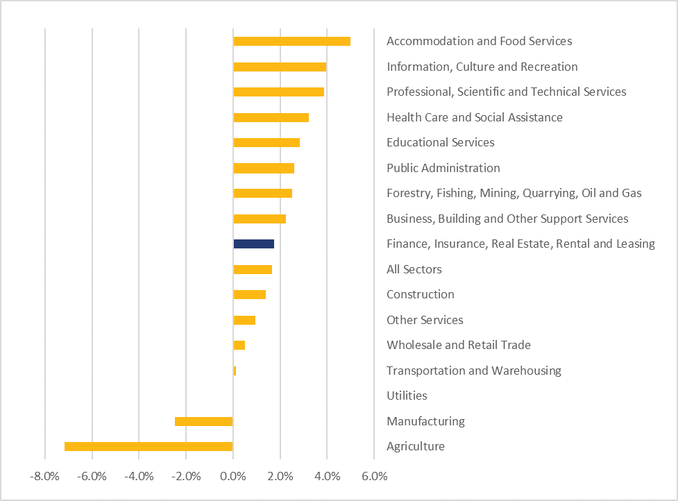 In absolute terms, the three sectors with the largest increases in employment were health care and social assistance (79,600 jobs created); professional, scientific and technical services (62,500 jobs created); and accommodation and food services (45,600 jobs created). The agriculture and manufacturing sectors are the only ones that experienced a decrease in employment over that period (‑ 7.2%, or 19,900 jobs lost and -2.5%, or 43,300 jobs lost, respectively).