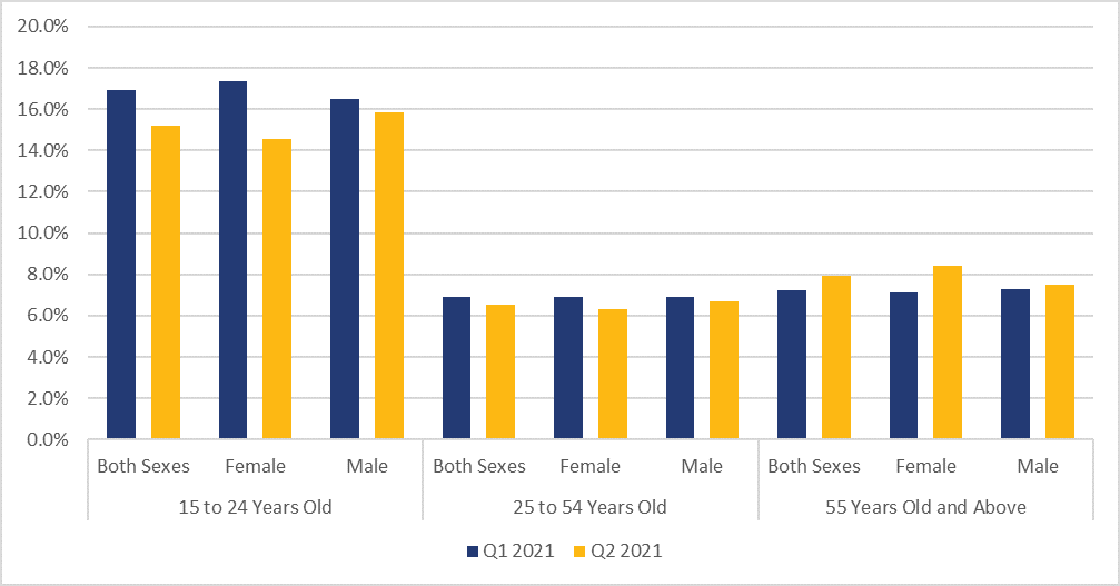 Those aged between 15 and 24 years experienced a decrease in unemployment of 1.7 percentage points between the first and second quarters of 2021. This was driven by a decrease in unemployment for women of 2.7% between the first and second quarters of 2021. Individuals aged between 25 and 54 years experienced a decrease of 0.4 percentage points in unemployment, while those aged 55 years and over experienced an increase of 0.1 percentage points in unemployment.