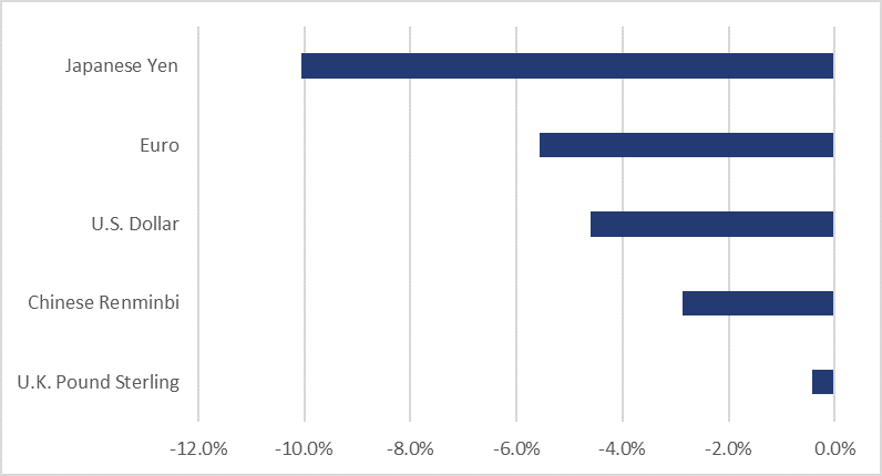 Figure 6 shows that, over the December 2020 to June 2021 period, the value of the Japanese yen, euro, U.S. dollar, Chinese renminbi and U.K. pound sterling decreased by 10.0%, 5.6%, 4.6%, 2.9% and 0.4%, respectively, relative to the value of the Canadian dollar.