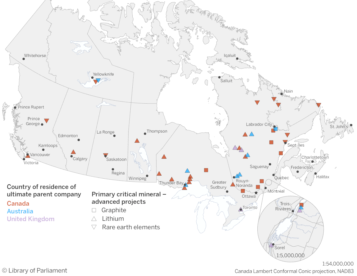 Sources: Map prepared by the Library of Parliament, 2025, using data obtained from Natural Resources Canada (NRCan), “Canada’s Critical Minerals Map,” Interactive map, accessed 6 May 2025; Statistics Canada, Inter-corporate Ownership, 2024, 16 June 2025; S&P Global, “S&P Capital IQ,” Database, accessed in June 2025; web sites of various corporations; NRCan, Administrative Boundaries in Canada – CanVec Series – Administrative Features, 1:5M, 1 March 2019; NRCan, Lakes, Rivers and Glaciers in Canada – CanVec Series – Hydrographic Features, 1:5M, 1 March 2019. The following software was used: Esri, ArcGIS Pro, version 3.4.2. Contains information licensed under the Open Government Licence – Canada and the Statistics Canada Open Licence.